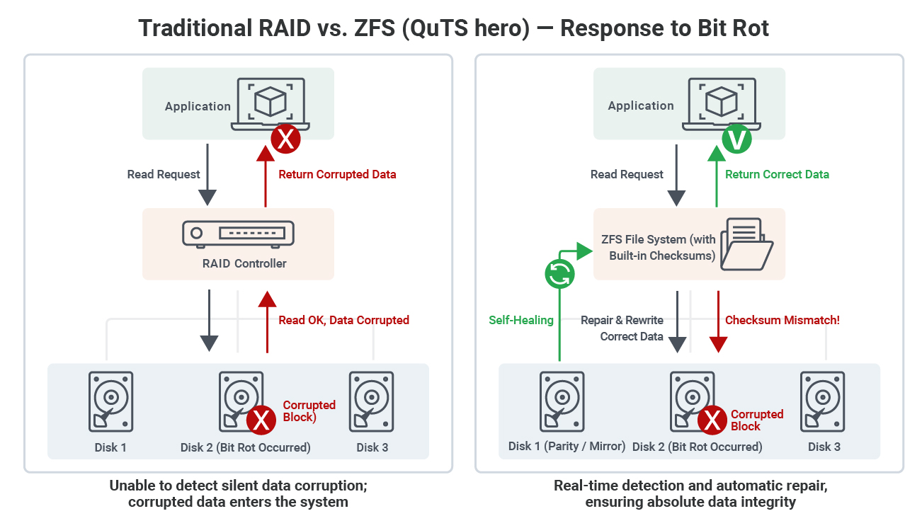 In traditional hardware RAID architecture, the controller usually only intervenes when a hardware failure (Fail) occurs at hard disk drives. If only the content of a single block is corrupted, traditional RAID cannot detect that the data has been damaged during reading, and may even provide incorrect Data Sync to the backup system, resulting in catastrophic chain reactions.