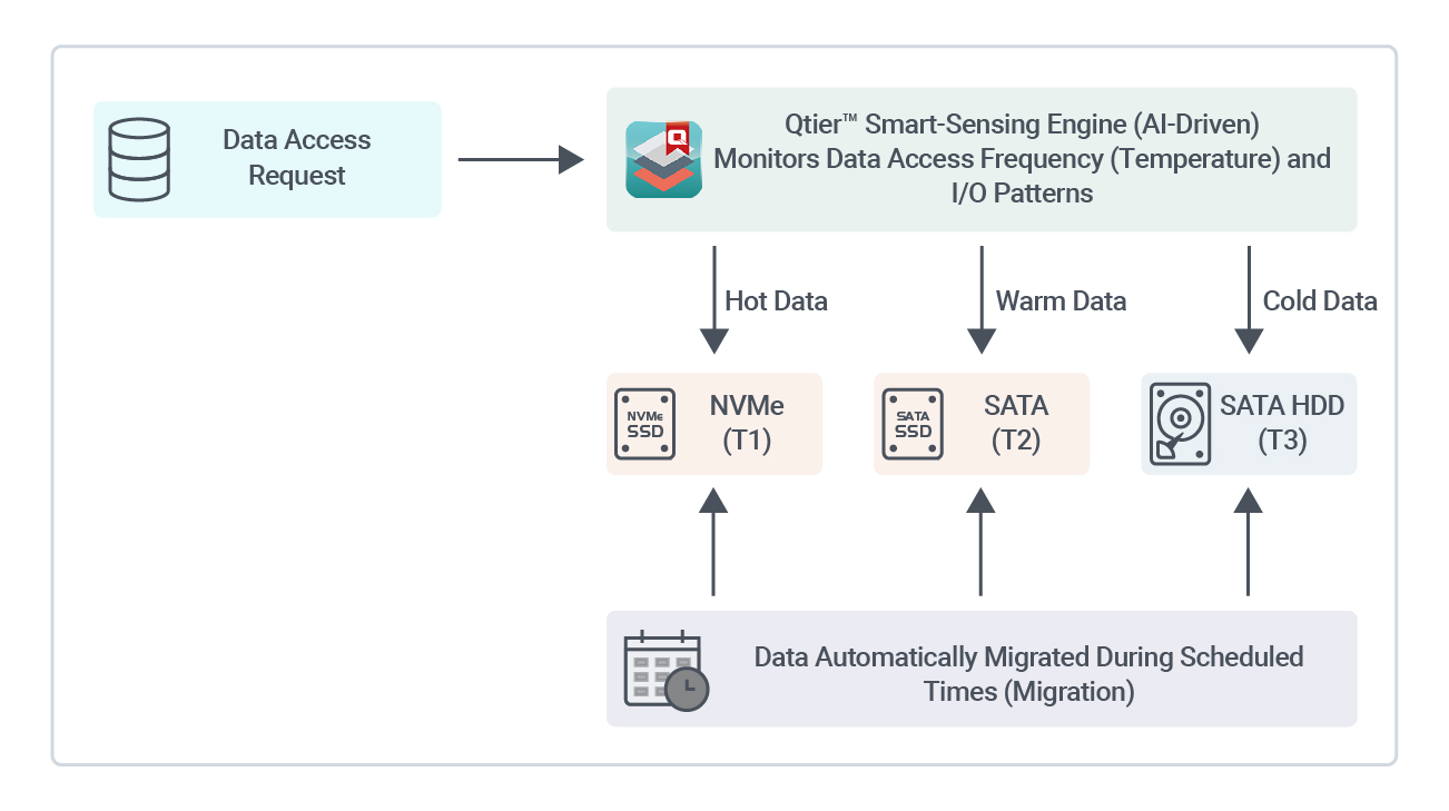 - Qtier (automatic tiering) — “intelligent migration”: The data is “moved” to the appropriate tier based on its heat. SSD stores the original data blocks, and its space is fully integrated into the total capacity, without wasting any purchased SSD space.