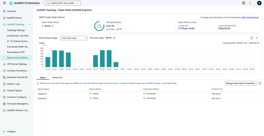 为了解决 NAS 位处层层防火墙后或缺乏公网 IP 的连接痛点,本次更新推出了 Super Node 云端中继服务,这项技术让用户即使在未购置 QNAP 实体路由器或无 QuWAN 架构的环境下,也能快速创建异地 NAS 间的加密连接。