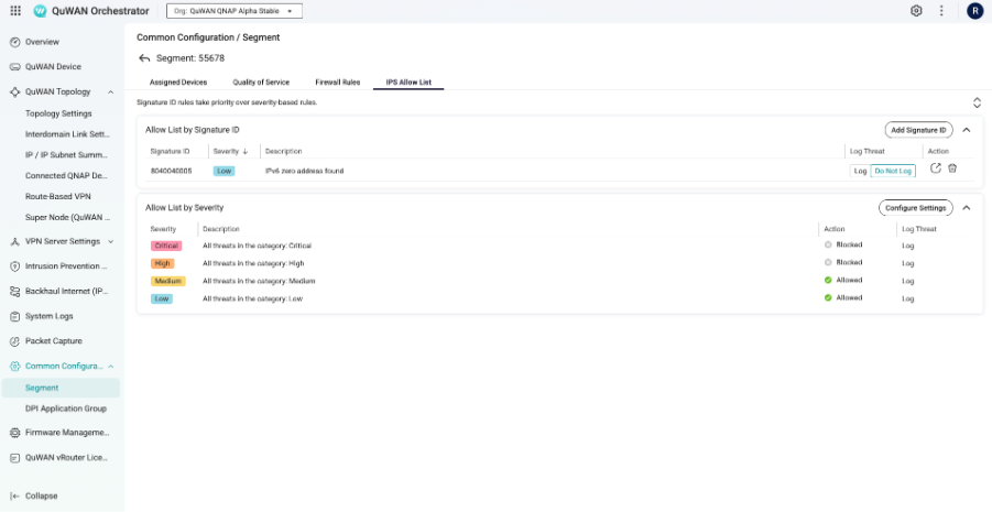 为了提升管理灵活性,QuWAN Orchestrator 强化了入侵预防系统(IPS)的设置功能。现在支持 Segment 层级的防火墙规则与白名单套用,管理员可将一致的安全政策快速部署至特定 Segment 内的所有设备。