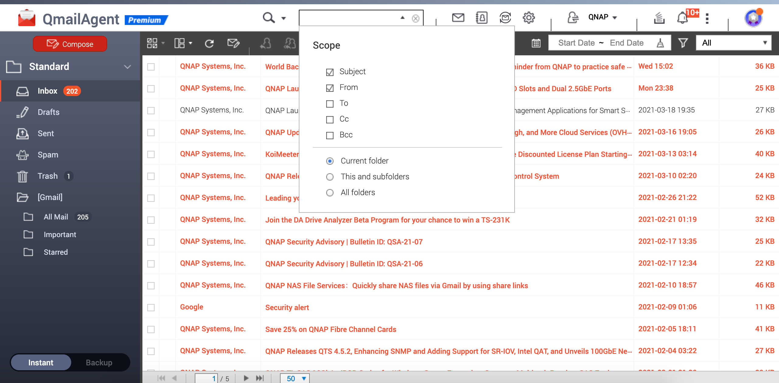 QmailAgent 电子邮件帐户管理服务提供简单易用的使用体验,还可通过关键词、筛选功能、内容、附件来寻找电子邮件,并直接预览阅读电子邮件内容。