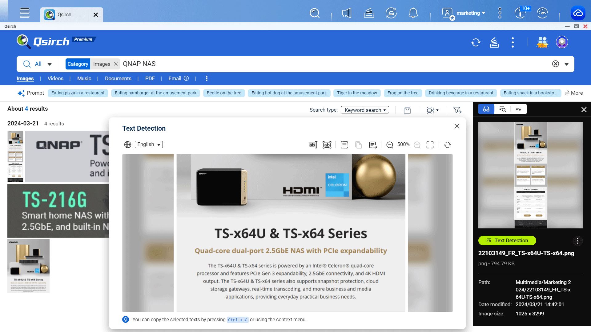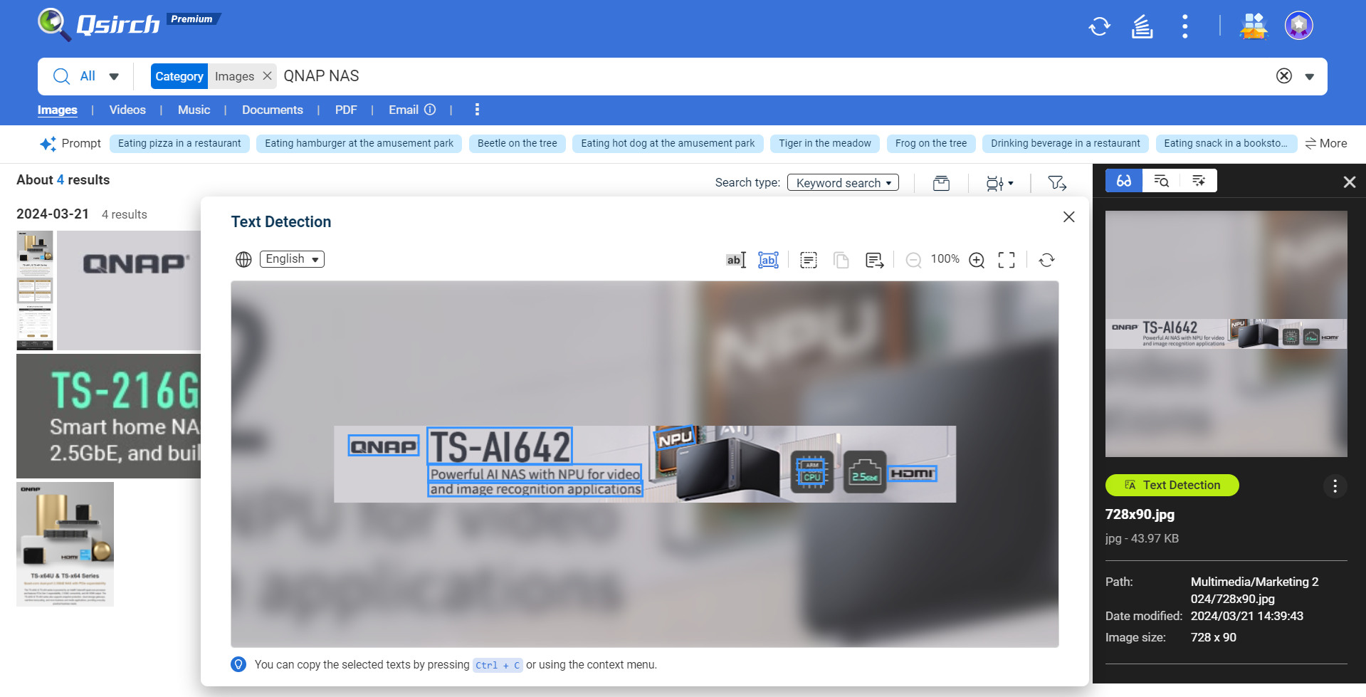 Qsirch 支持 AI OCR 图片文字识别与数据提取能力。搜索、选取您需要的图片,点选 「Text Detection」,即可复制或下载 (.txt 文本文件) 图片中的文字保存或使用。