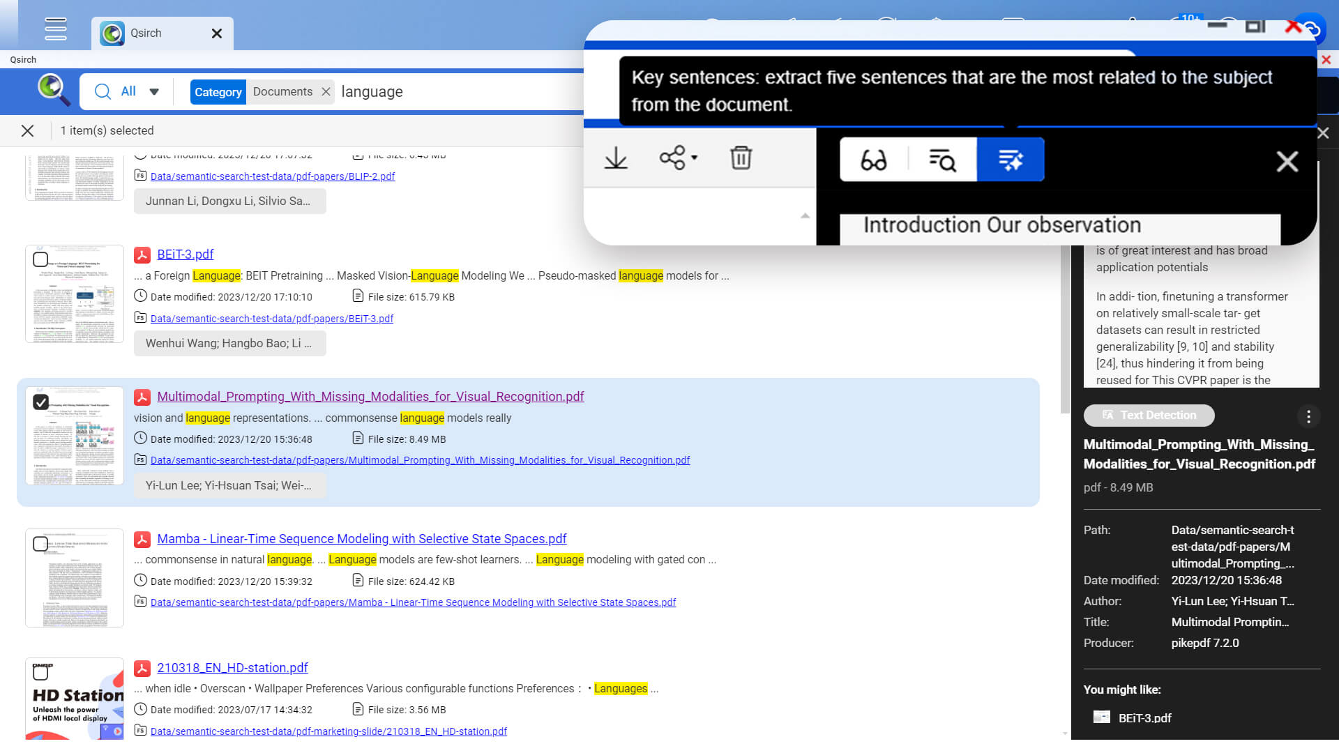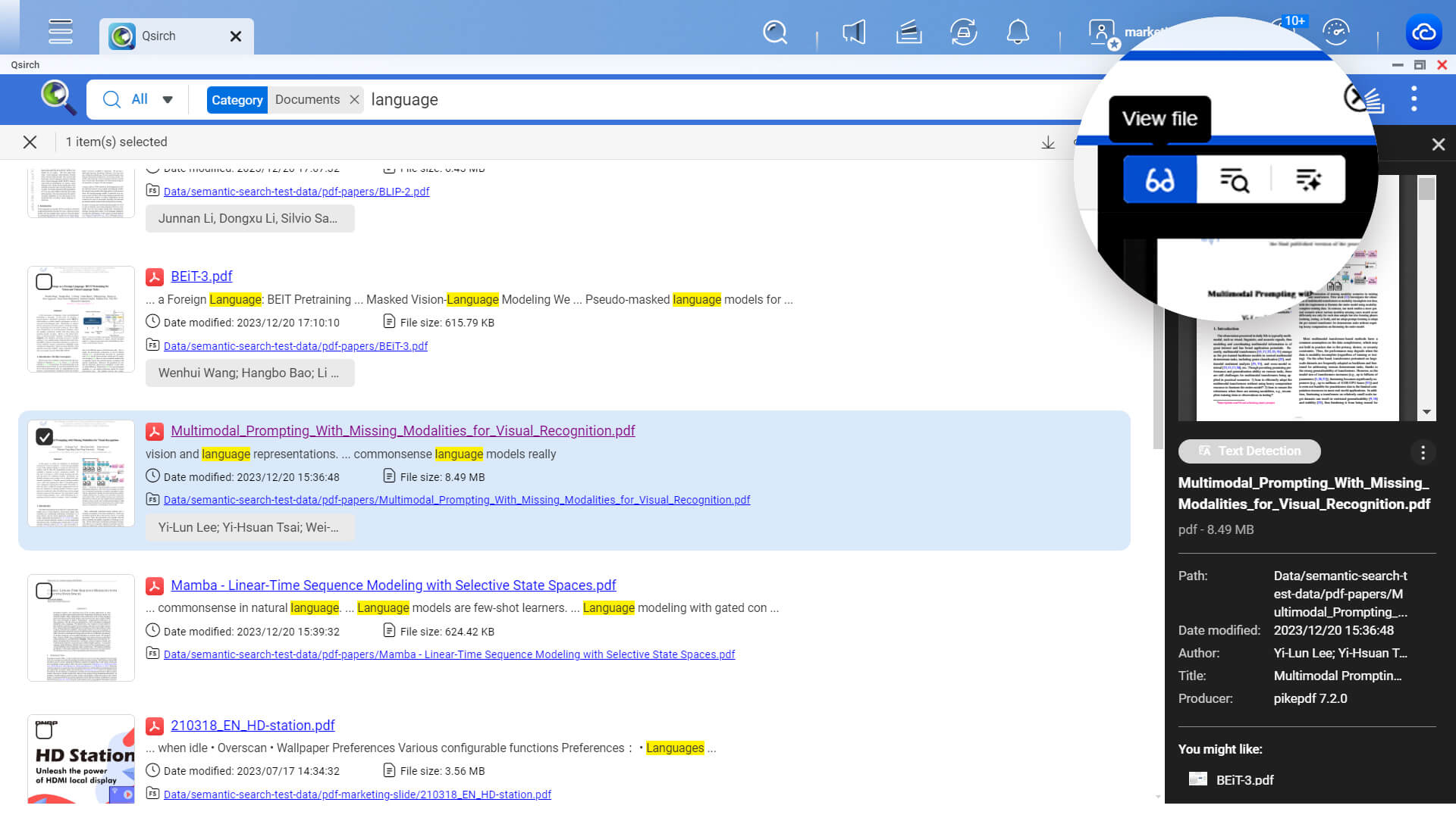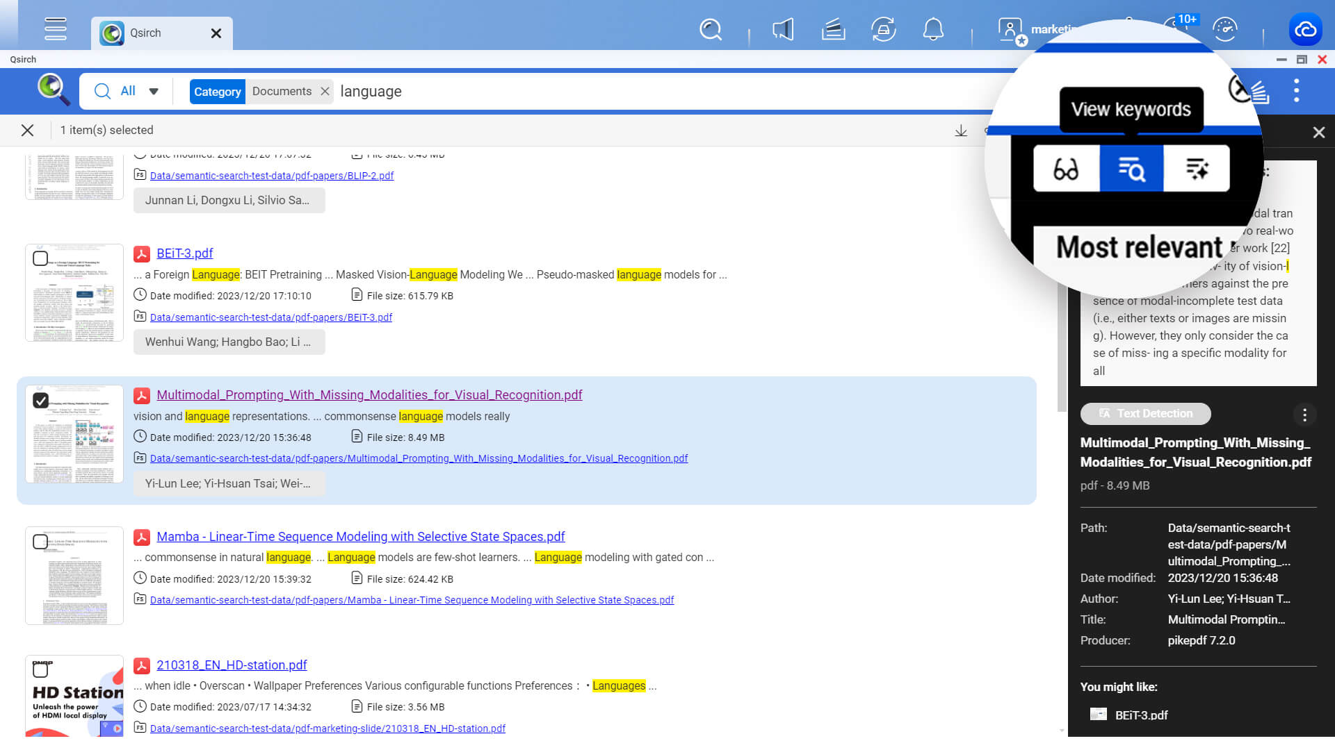 Qsirch 支持 AI 驱动的语意搜索 (Semantic Search) 功能,让图片搜索更准确!您能以更直观且口语化的描述句作为搜索指令 (支持达 23 种语言),缩小搜索范围以达准确的搜索结果,体验更效率的文件搜索。