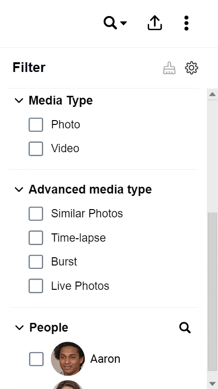 QuMagie 提供各式筛选器,让您利用人物、日期、标签、事物、地点,甚至是媒体类型轻易地找到想找的照片。您还可使用「包含」及「排除」做更进阶的筛选,缩小搜寻范围。