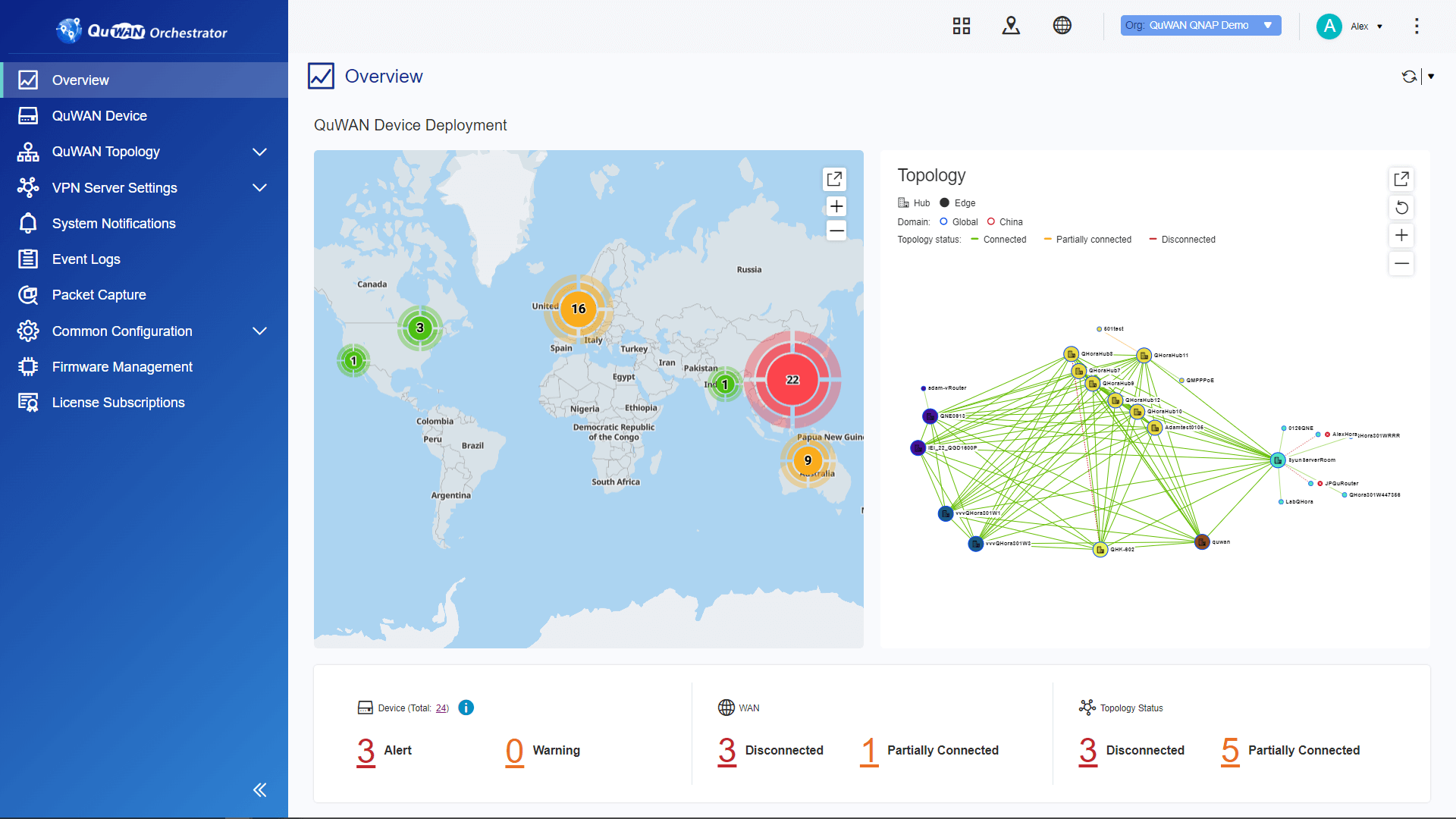 QuWAN 云端中控系统 (QuWAN Orchestrator) 提供便利且功能强大的云端网络集中部署与管理平台,IT 人员于总部即能远程部署各分点的所有地端网络设备,而不需亲至各地进行繁杂的网络布建,实实在在达到零接触部署 (ZTP, Zero Touch Provisioning),同时能在单一平台上执行带宽监控、参数设定、使用分析等多项功能。IT 人员可通过一目了然的仪表板 (Dashboard)、可视化的拓普与 eMap 接口实时监控网络状况,并能随时导出网络分析报表,以更直接、有效率的方式完成跨国多分点大型网络的管理运维。