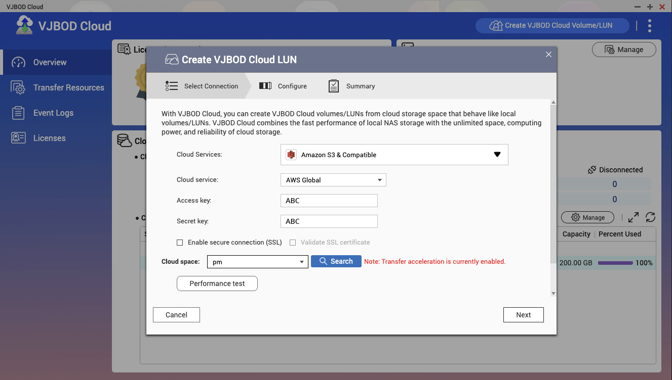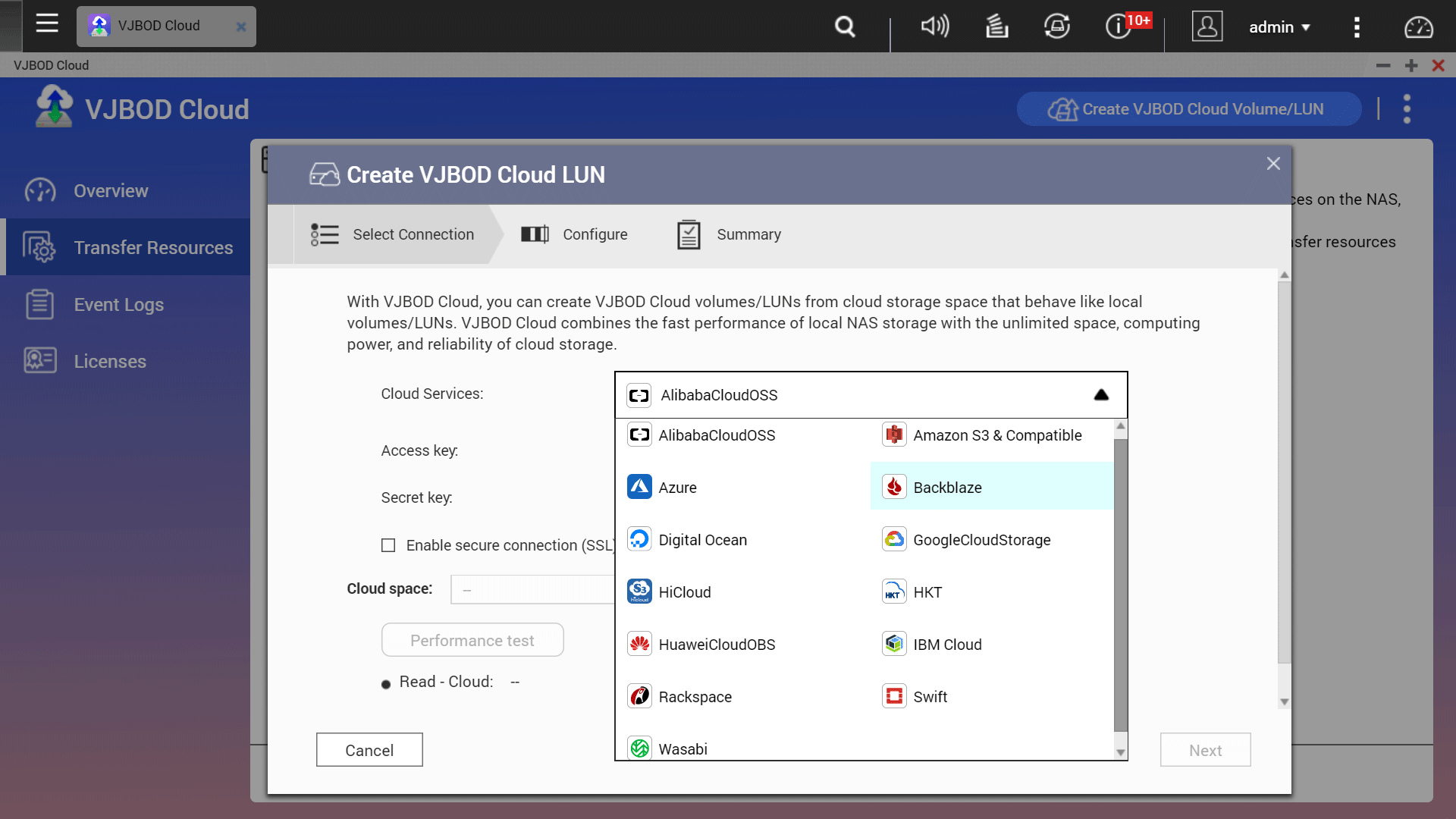 于 App Center 下载 VJBOD Cloud,可建立云端磁盘区或云端 LUN,并选定连接的云端服务。