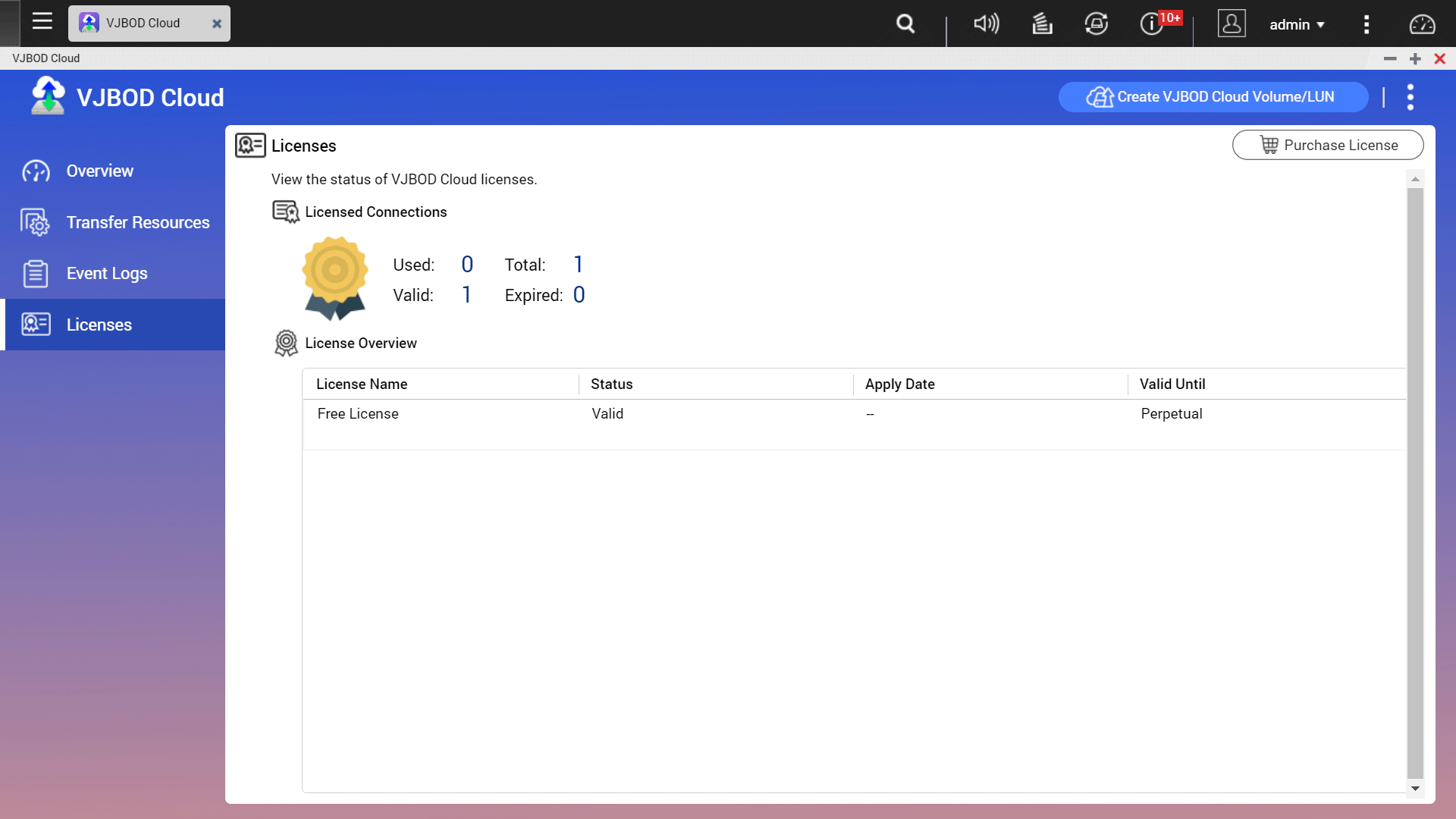 VJBOD Cloud 提供 1 个免费的联机授权,您可依需求再额外添购授权,共可连接多达 9 个云端存储空间 (Bucket)。一个云端存储空间可建立多个云端磁盘区与 LUN*。