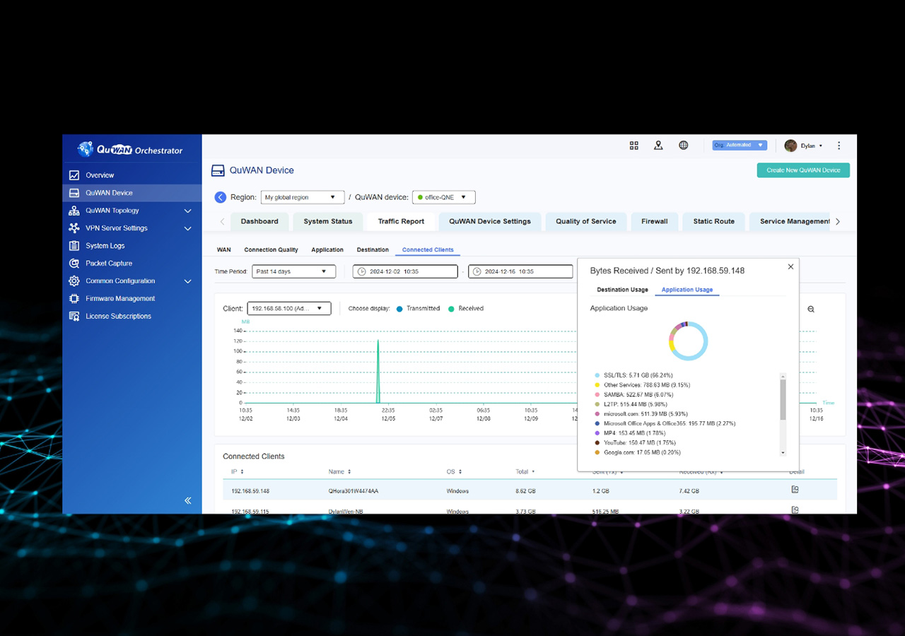QuWAN SD-WAN 提供详尽的流量报告,让您轻松掌握网络运作状况。通过历史统计数据,可追踪流量趋势并进行性能分析;结合联机质量监控,能实时发现并优化潜在瓶颈。此外,详细的终端联机状态报告,让 IT 管理员对每个节点的健康度一目了然,全面提升企业网络的稳定性与效率。