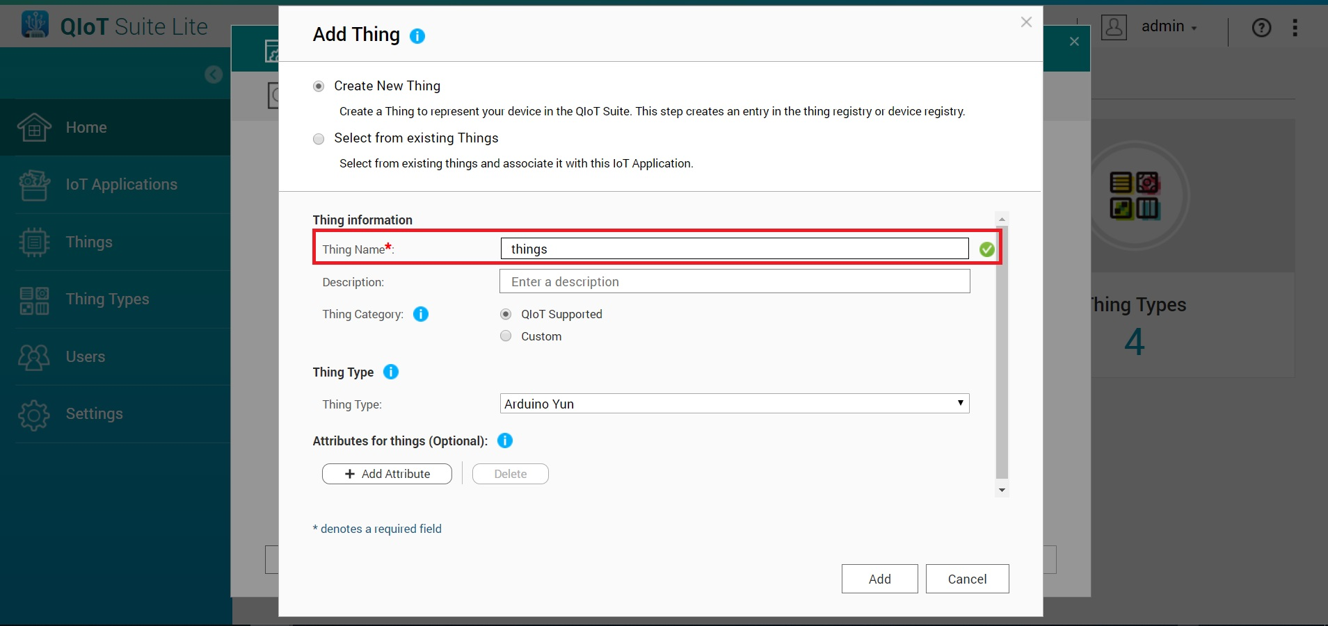 单击“Add”(添加),可以从现有 IoT 设备中进行选择,也可以创建新 IoT 设备。