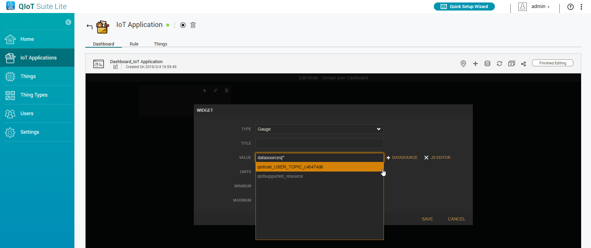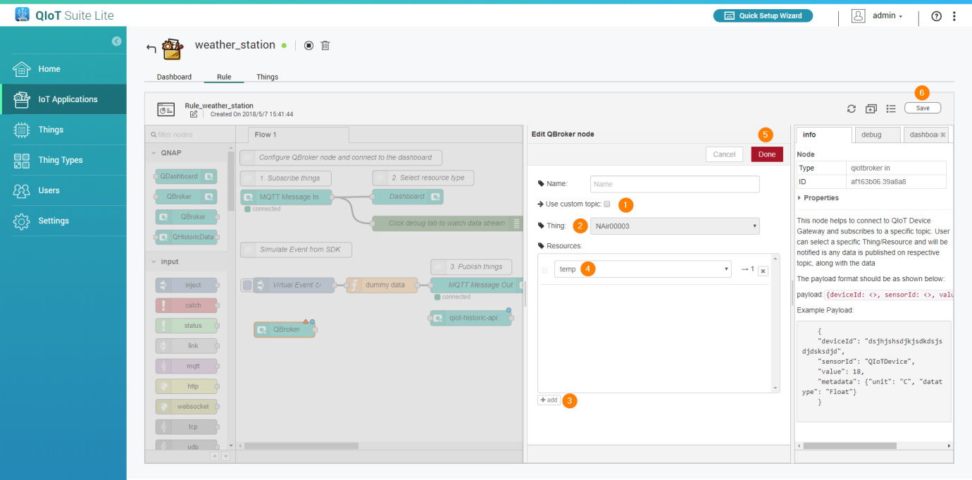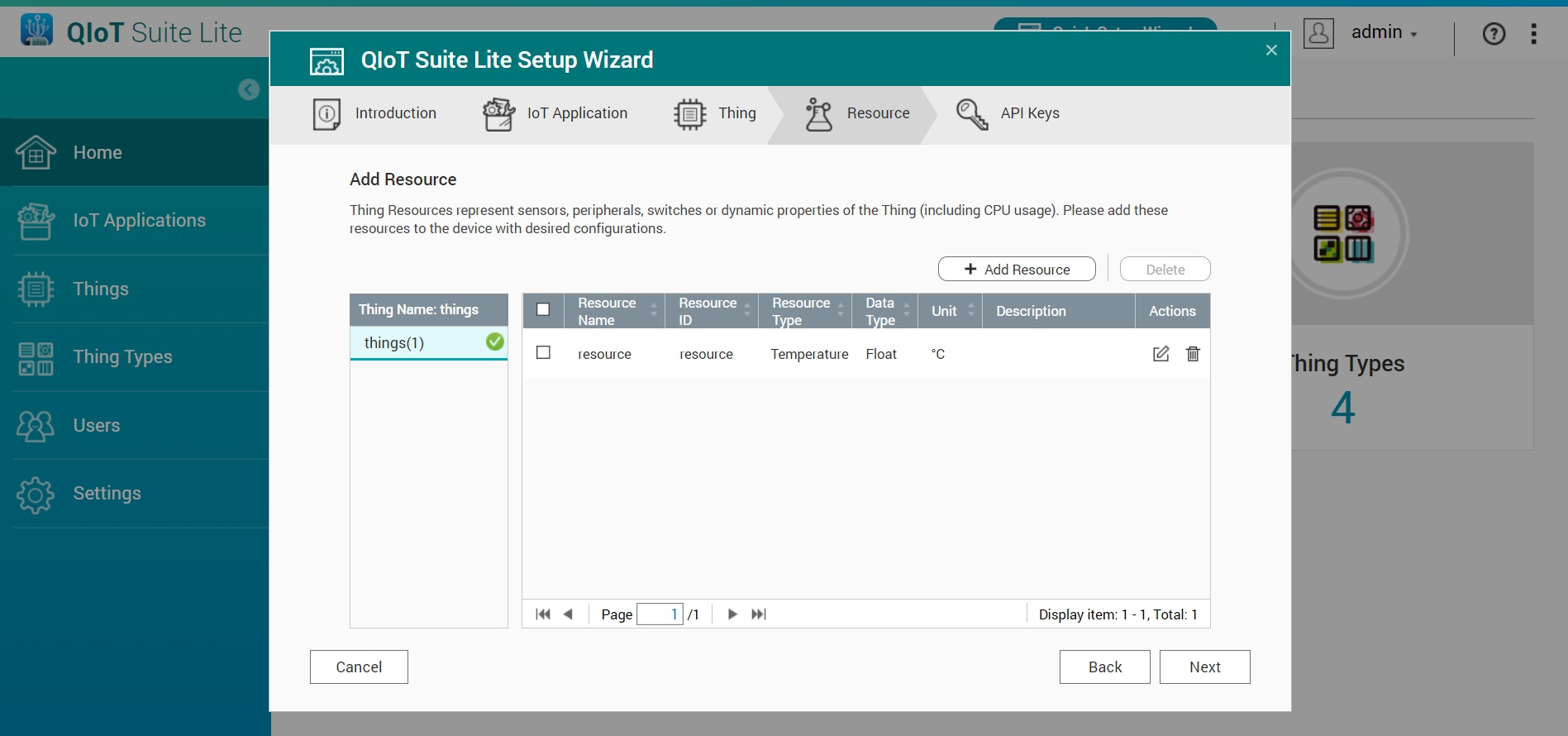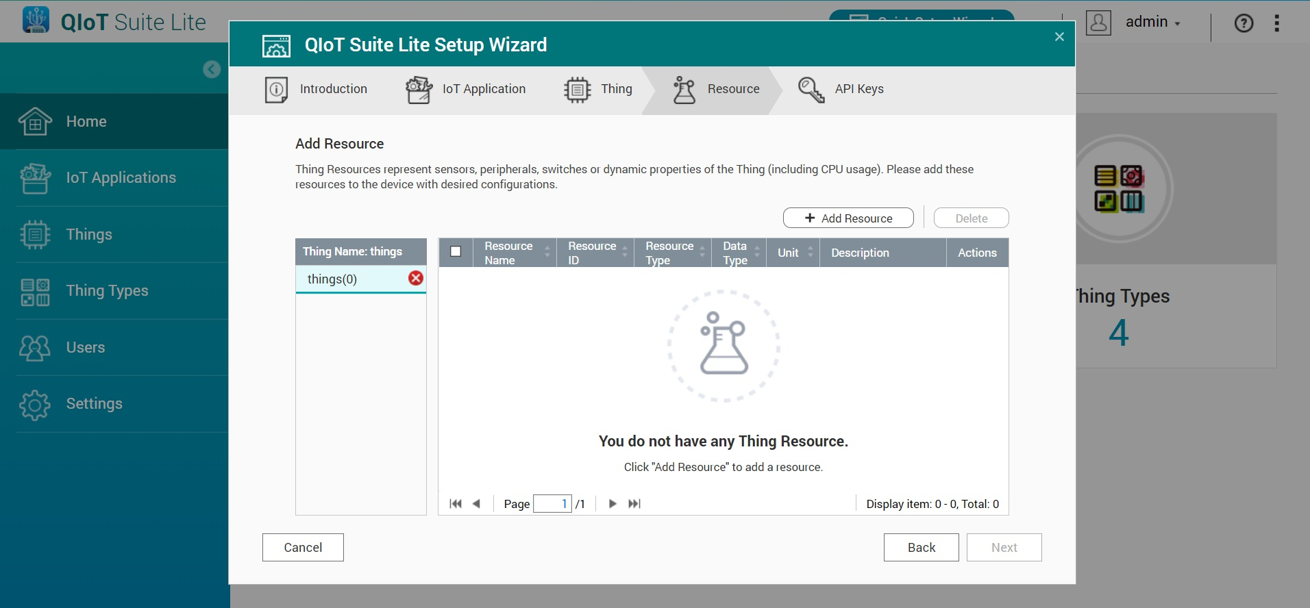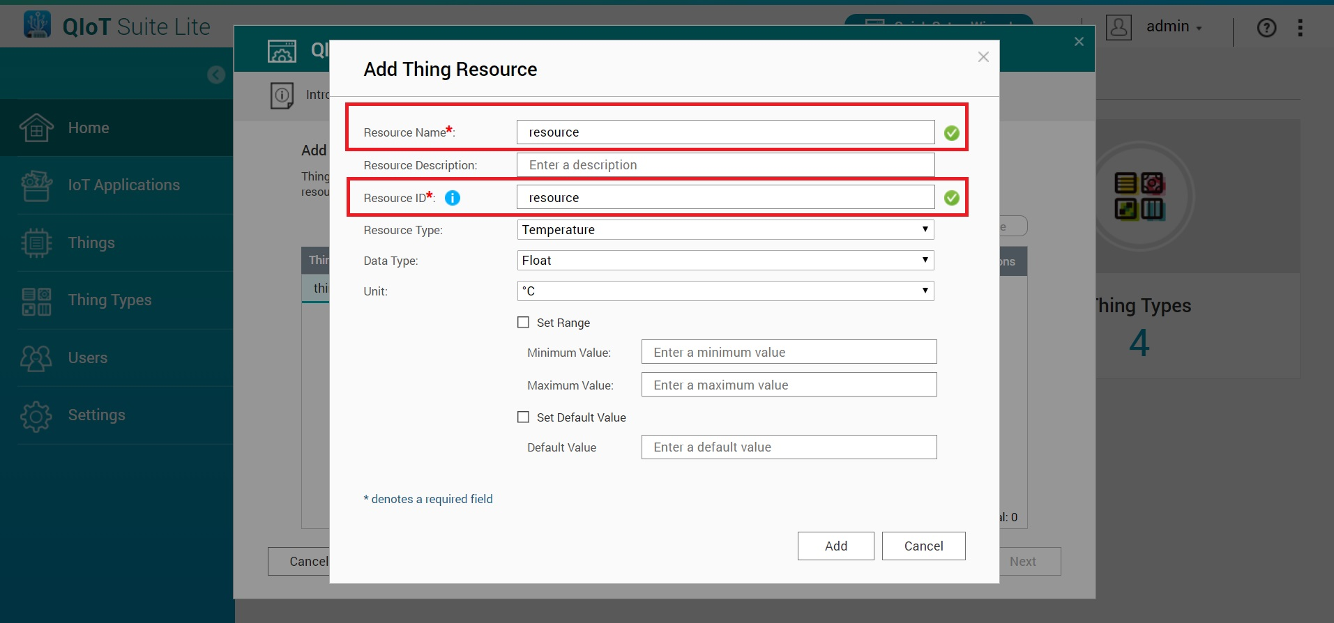 IoT 设备资源是指传感器、外设、交换机或者需要传输或接收的其他数据通道或状态。添加资源意味着创建数据通道 ID(MQTT →主题、HTTP 和 CoAP→ URL)以与 QIoT Suite Lite 连接。将这些资源添加到您的设备,并根据需要进行设置。