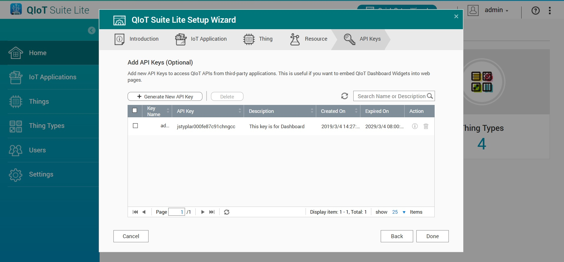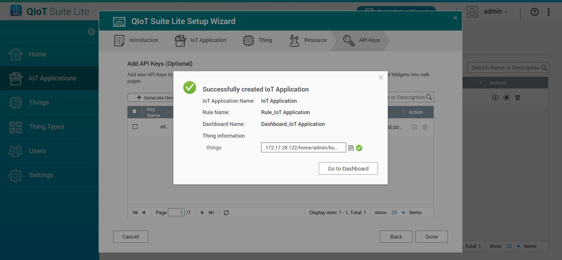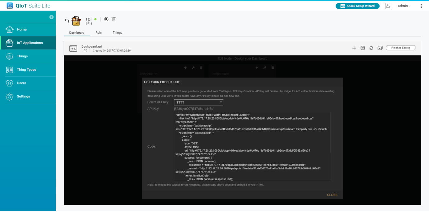 在此步骤中添加 API 密钥,以便第三方应用程序访问 QIoT Suite Lite API。要在网页上嵌入 QIoT Suite Lite 仪表板小组件,可以使用 API 密钥。
