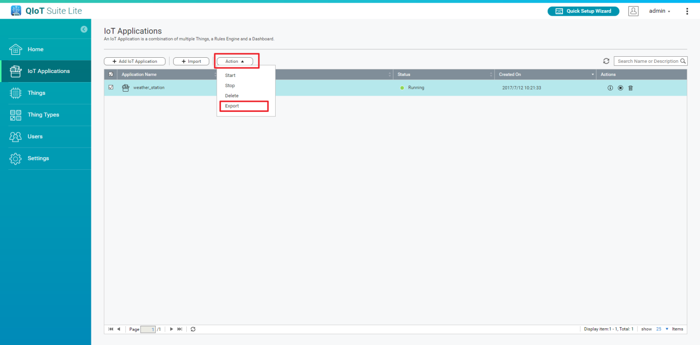 这将保存 IoT 应用程序的配置以便备份或迁移。首先,单击要导出的 IoT 应用程序(每次只能导出一个),然后单击“Action”(操作)>“Export”(导出),并将文件另存为新文件。