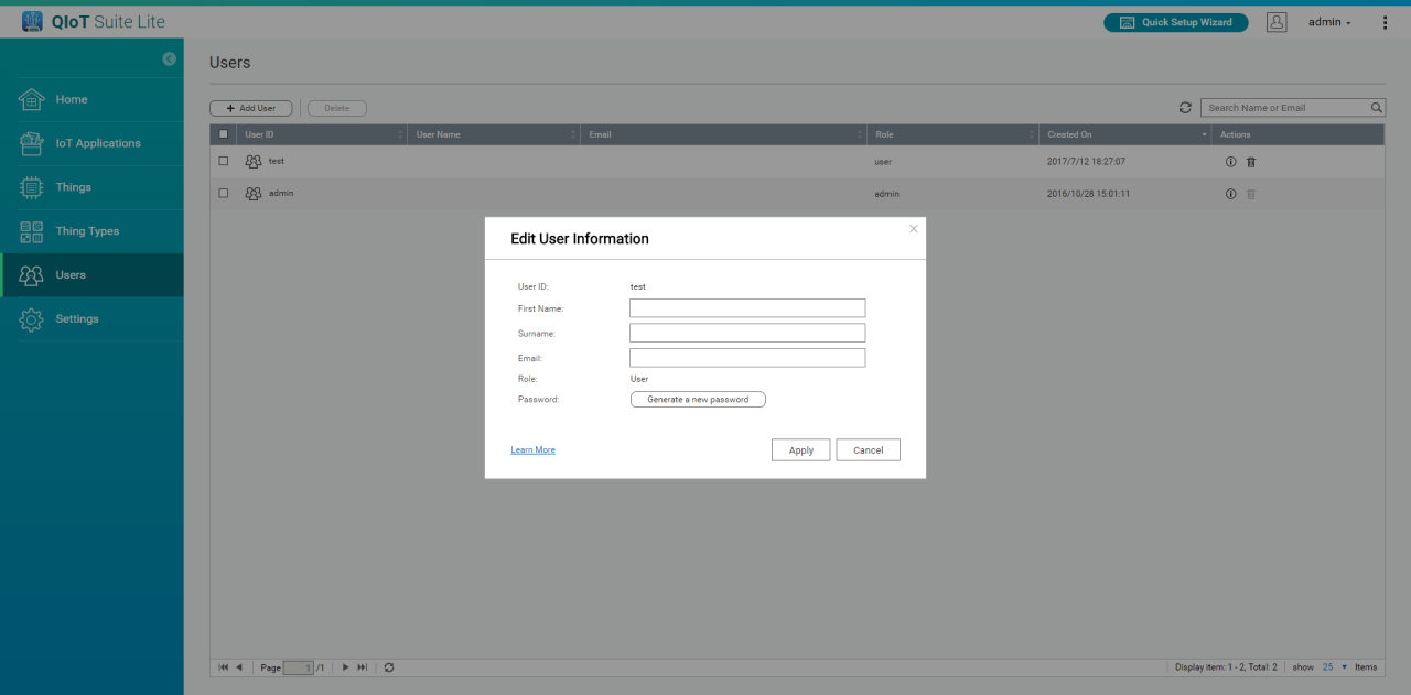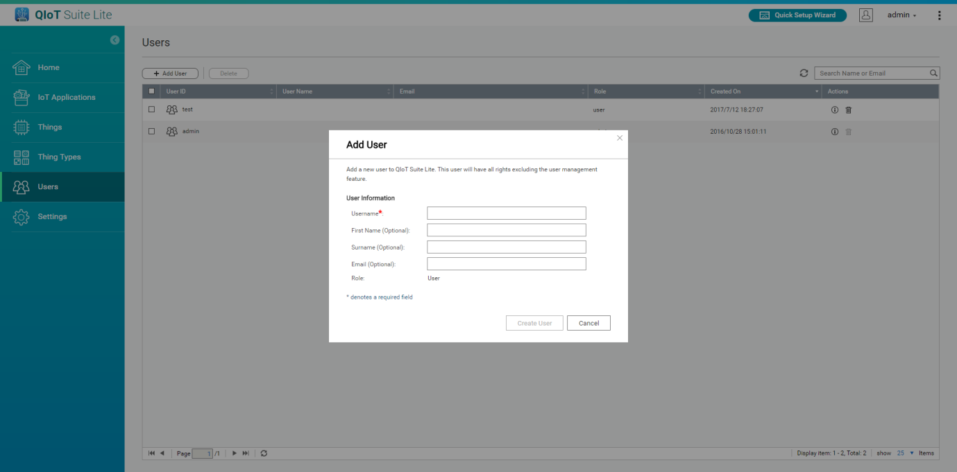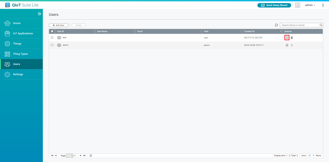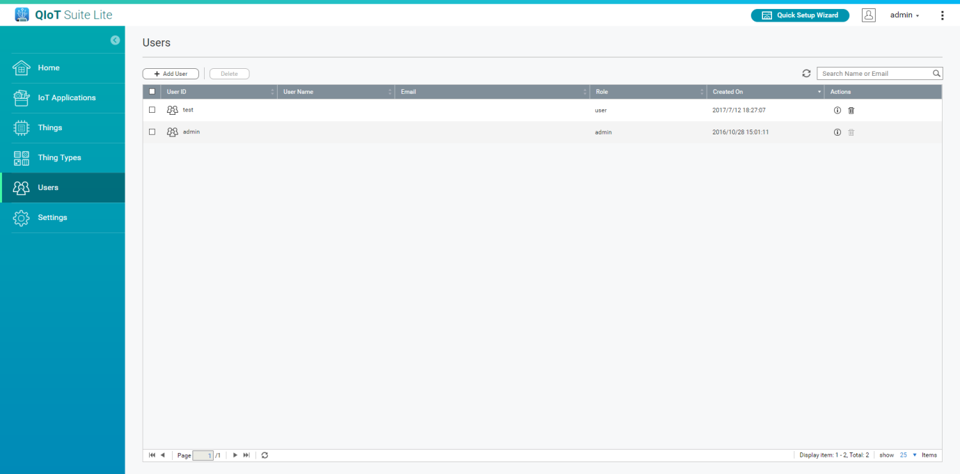 您可以添加、编辑、删除并列出所有用户(仅 QIoT Suite Lite)。