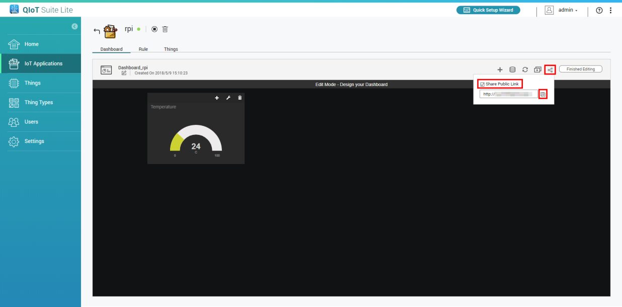 单击 并选择“Share Public Link”(共享公开链接)和“Copy Public Link”(复制公开链接)以便与其他用户共享仪表板。