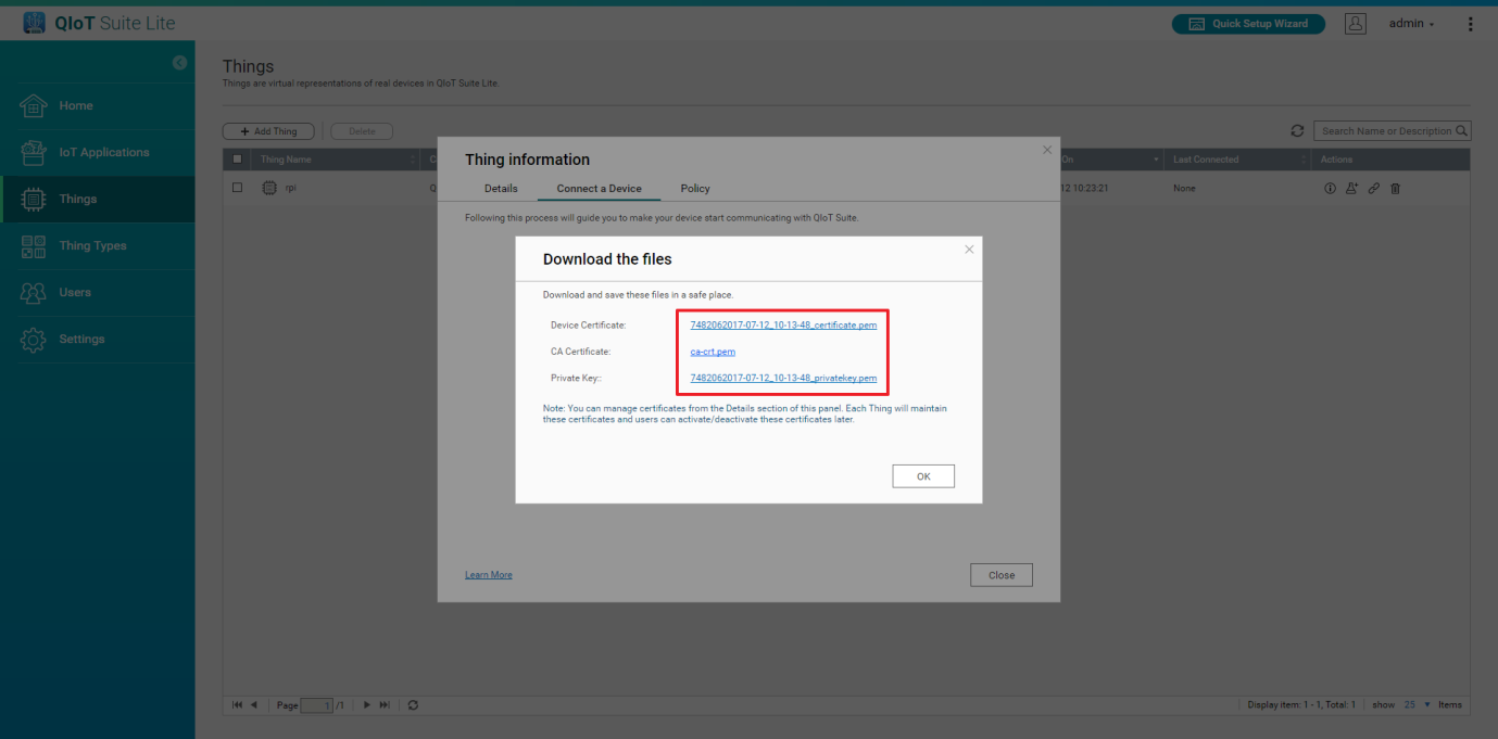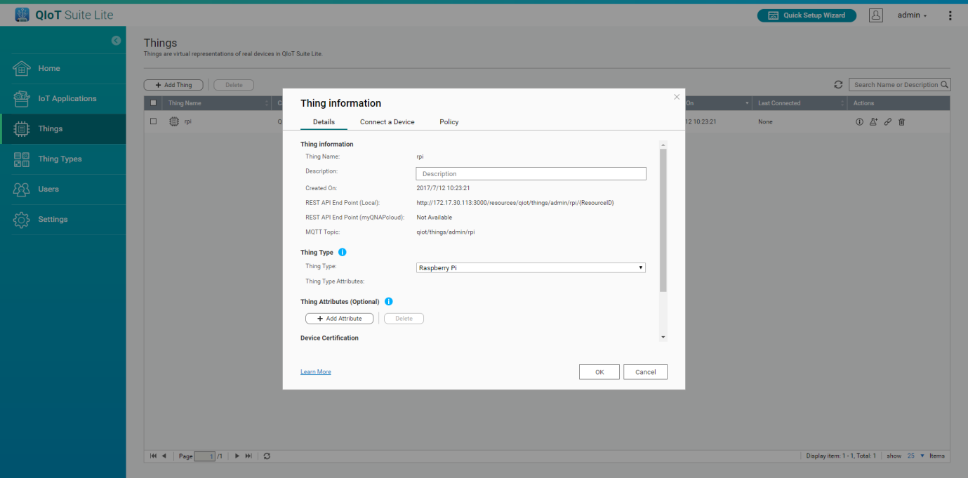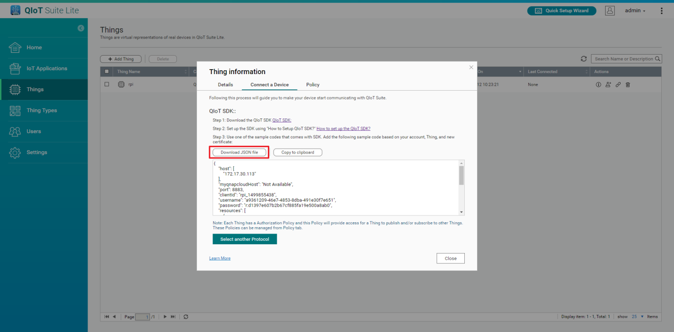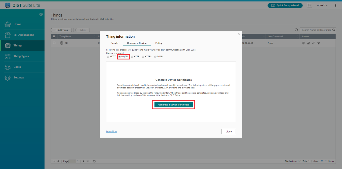 您可以将 myQNAPcloud 生成的 Internet 地址与支持的协议(例如,MQTT、HTTP、HTTPS、CoAP)配合使用。但是,如果要使用 MQTTS,Internet 地址必须由使用设备网关的 QIoT Suite Lite 服务器进行更新,从而为对象生成设备凭据(使用 MQTTS 的前提条件)。