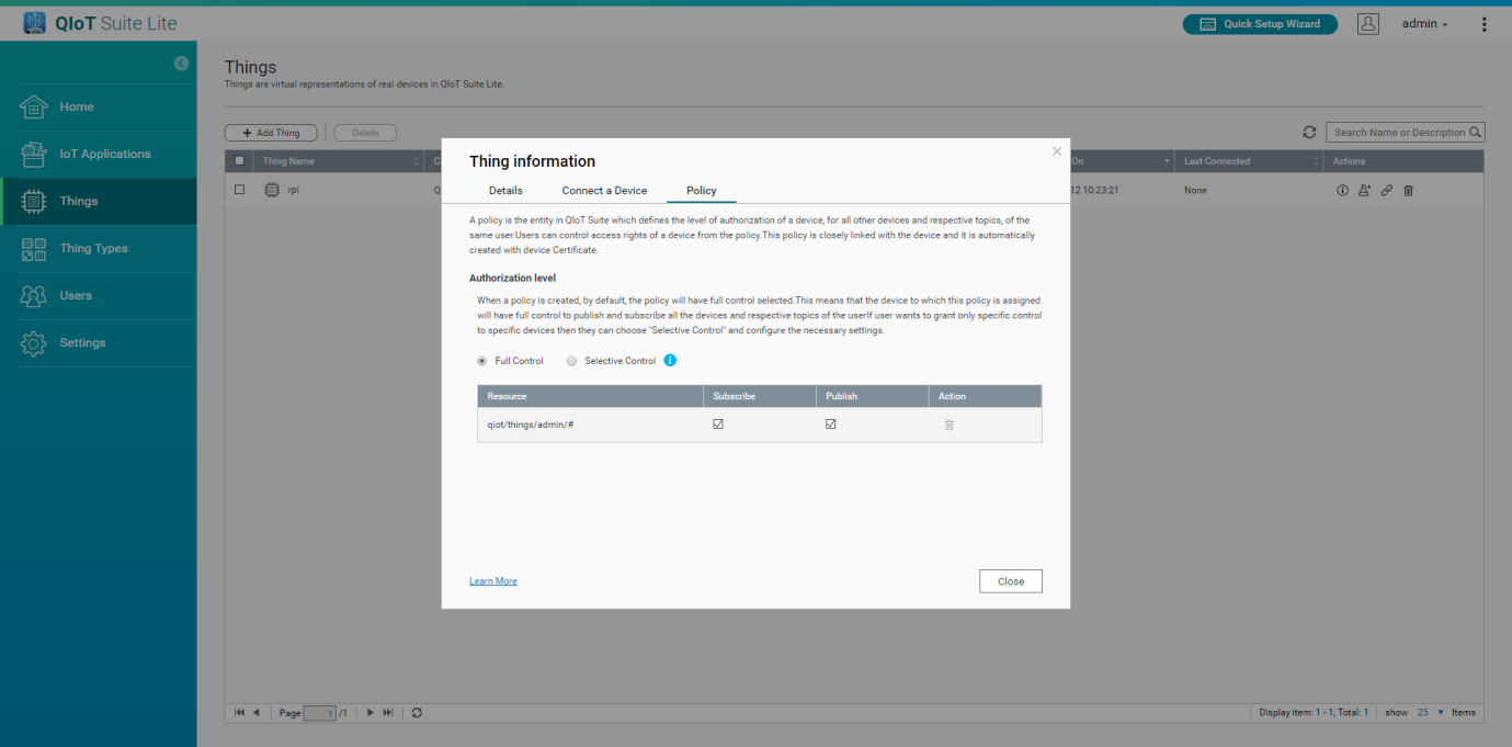 创建规则后,系统会默认选择控制。在发布和订阅用户的所有其他设备和主题时,受此规则管理的 IoT 设备将具有完全权限控制。如果用户仅授予访问某些设备的某些权限,则用户可以选择“Selective Control”(选择性控制),并配置所需的设置。