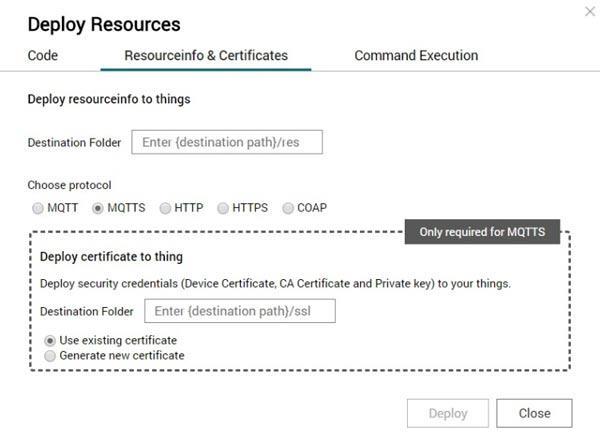 - Choose protocol(选择协议):选择 MQTT、MQTTS、HTTP、HTTPS 或 COAP(如果选择 MQTTS,必须设置 SSH 证书并将证书上传到目标文件夹。可以使用现有证书或创建新证书)