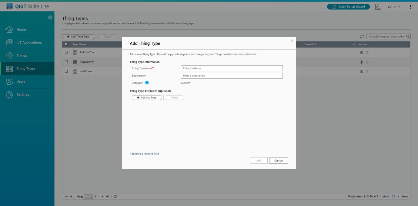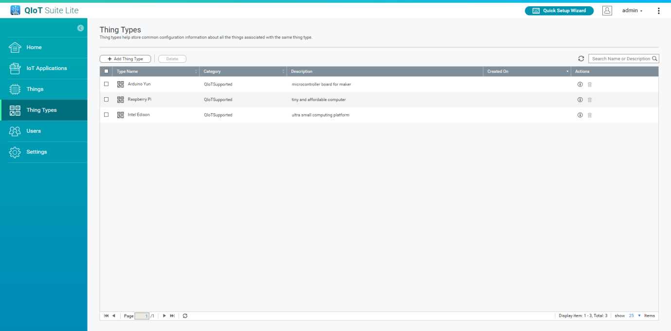 可以添加、修改和删除 IoT 设备类型。IoT 设备类型可帮助您组织不同的自定义 IoT 设备类型。无法删除 QIoT Suite Lite 中默认支持的 IoT 设备类型。