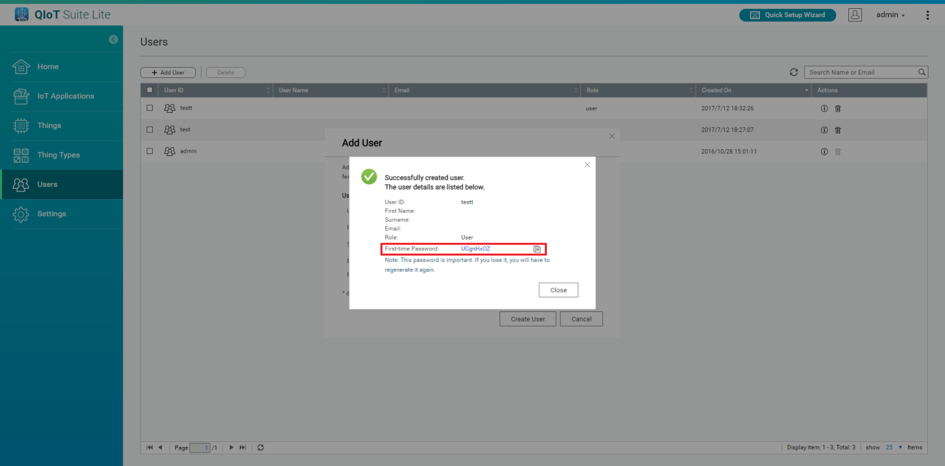 向 QIoT Suite Lite 中添加用户。用户将具有除管理员权限之外的其他权限。