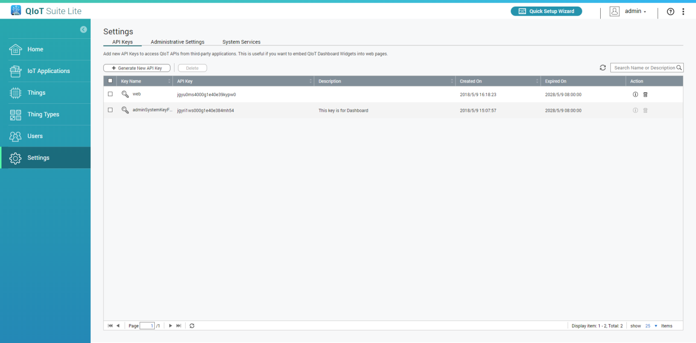 您可以添加 API 密钥,以便第三方应用程序访问 QIoT API。要在网页上嵌入 QIoT 仪表板小组件,可以使用 API 密钥(“adminSystemKeyForDashboard”是仪表板的默认密钥名称,无法更改)。