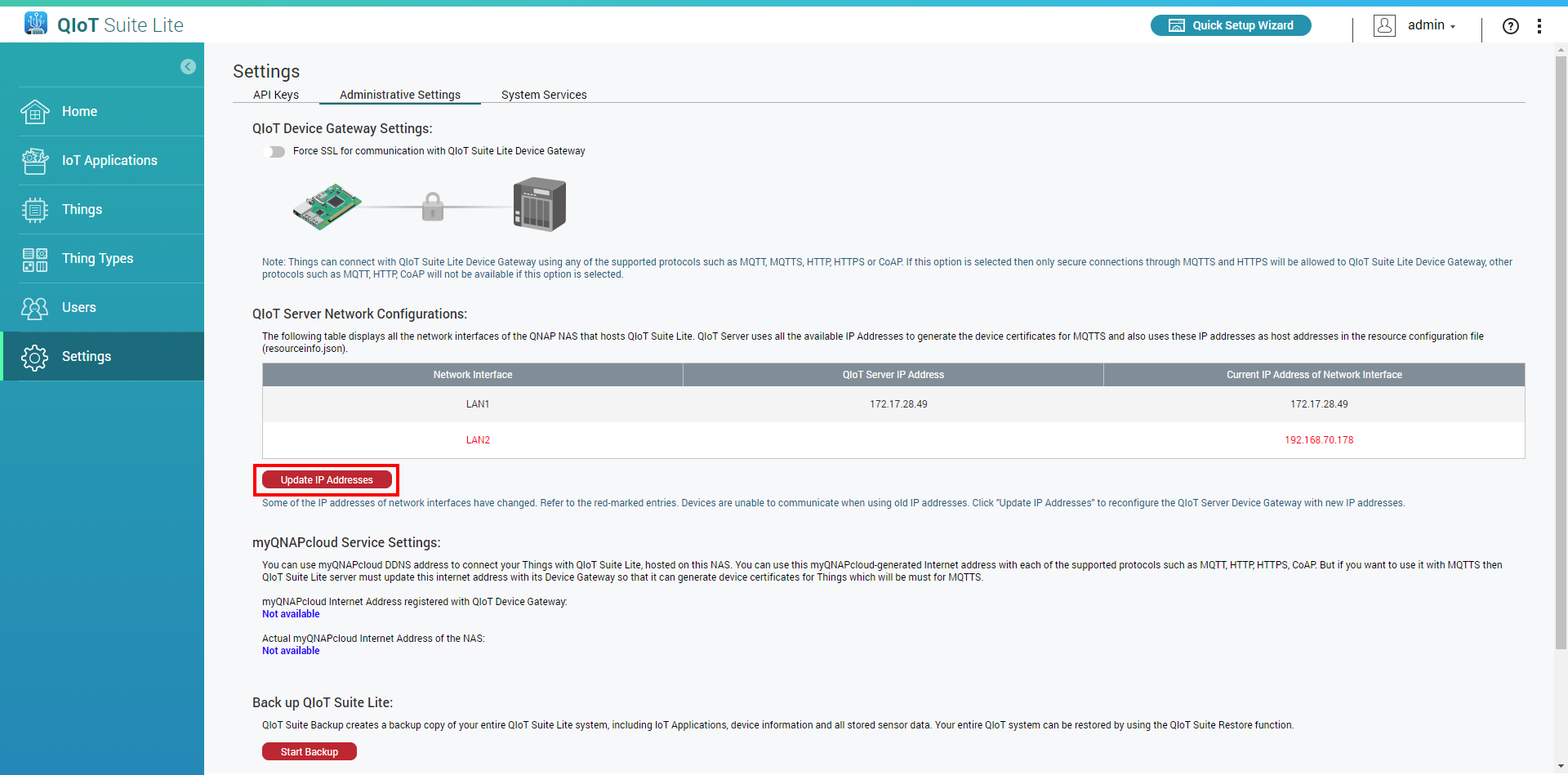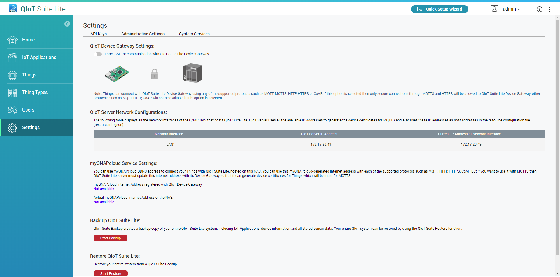 “Settings”(设置)页面提供 QIoT API 密钥管理、QIoT 安全设置、QIoT 服务器网络配置以及 myQNAPcloud 服务设置
