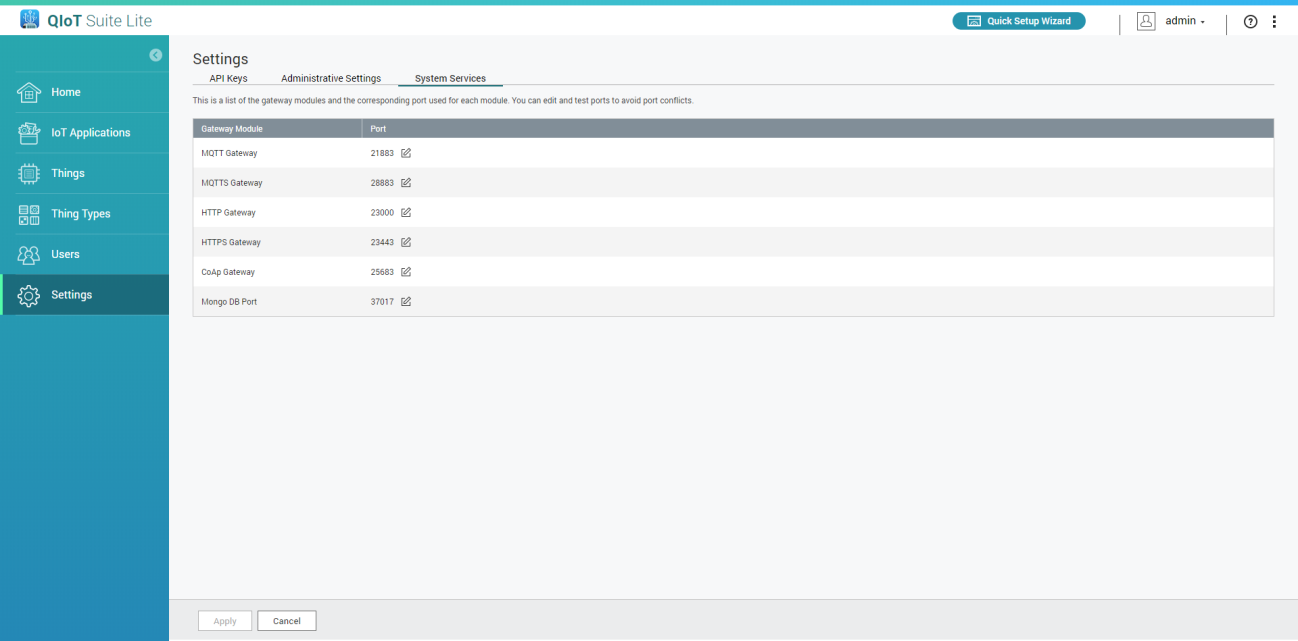 选择网关模块,单击以编辑端口,然后单击“Test”(测试)以检查端口当前是否正在使用。如果可以使用该端口,请单击“Apply”(应用)。QIoT Suite Lite 可能需要重启才能完成设置。