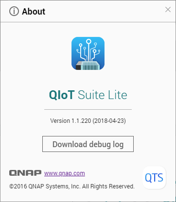 显示已安装的 QIoT Suite Lite 版本,并允许您下载调试日志以排除技术问题。